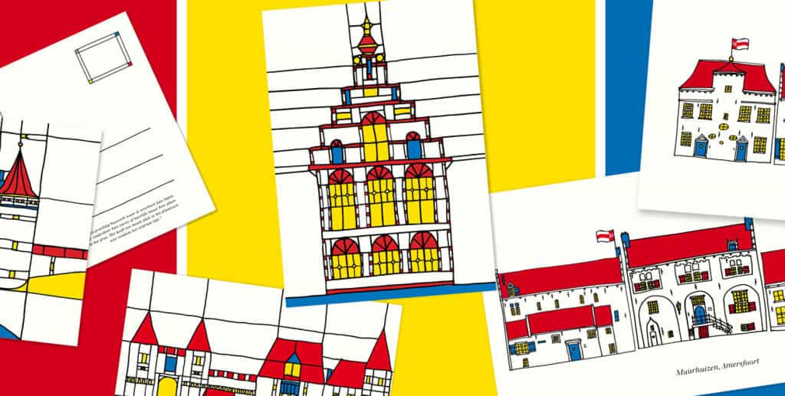 In onze verlovingstijd vroegen mijn schoonouders me een muurschildering te maken, gebaseerd op de stad en ‘iets met Mondriaan’. Weinig mensen weten dat hij hier geboren is. Dat vond ik zelf ook een mooi detail, dat zo’n groot kunstenaar in mijn stad geboren is. Mijn tekenstijl heeft wel iets van Mondriaan, door de abstractie en toen ik daarin met primaire kleuren ging werken ontstond een stijl waar ik mee verder wilde. Naast de Koppelpoort ben ik ook andere gebouwen gaan tekenen en zo ontstond een serie zeefdrukken van de stad. Zo’n serie maak je in een beperkte oplage, maar ik heb van de kunstwerken ook ansichtkaarten laten maken (zie afbeelding bovenaan). Daarmee ben ik gewoon een aantal winkels binnengestapt met de vraag of zij ze wilden verkopen. Inmiddels zijn er meer dan 6000 verkocht en heb ik een tweede serie ansichtkaarten gemaakt. Ik vind Mondriaan een groot kunstenaar. Wat me aanspreekt in zijn werk is dat hij steeds abstracter ging kijken. Zo ervaar ik dat ook. Door mijn tekenstijl kijk ik anders naar de wereld, maar het is nog wel herkenbaar. Dat maakt het ook interessant. Mensen zeggen: ‘Oh, het is de Koppelpoort,’ maar ik heb die maar voor een deel getekend. Als je gaat vergelijken, blijkt mijn weergave niet te ‘kloppen’. Ik vind het boeiend om te experimenteren met de herkenbaarheid, die leg je er bijvoorbeeld in door details te vergroten.
