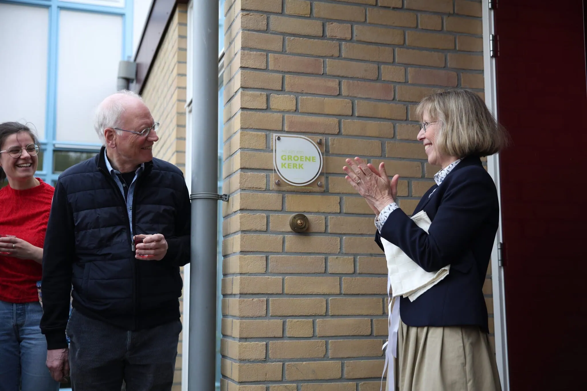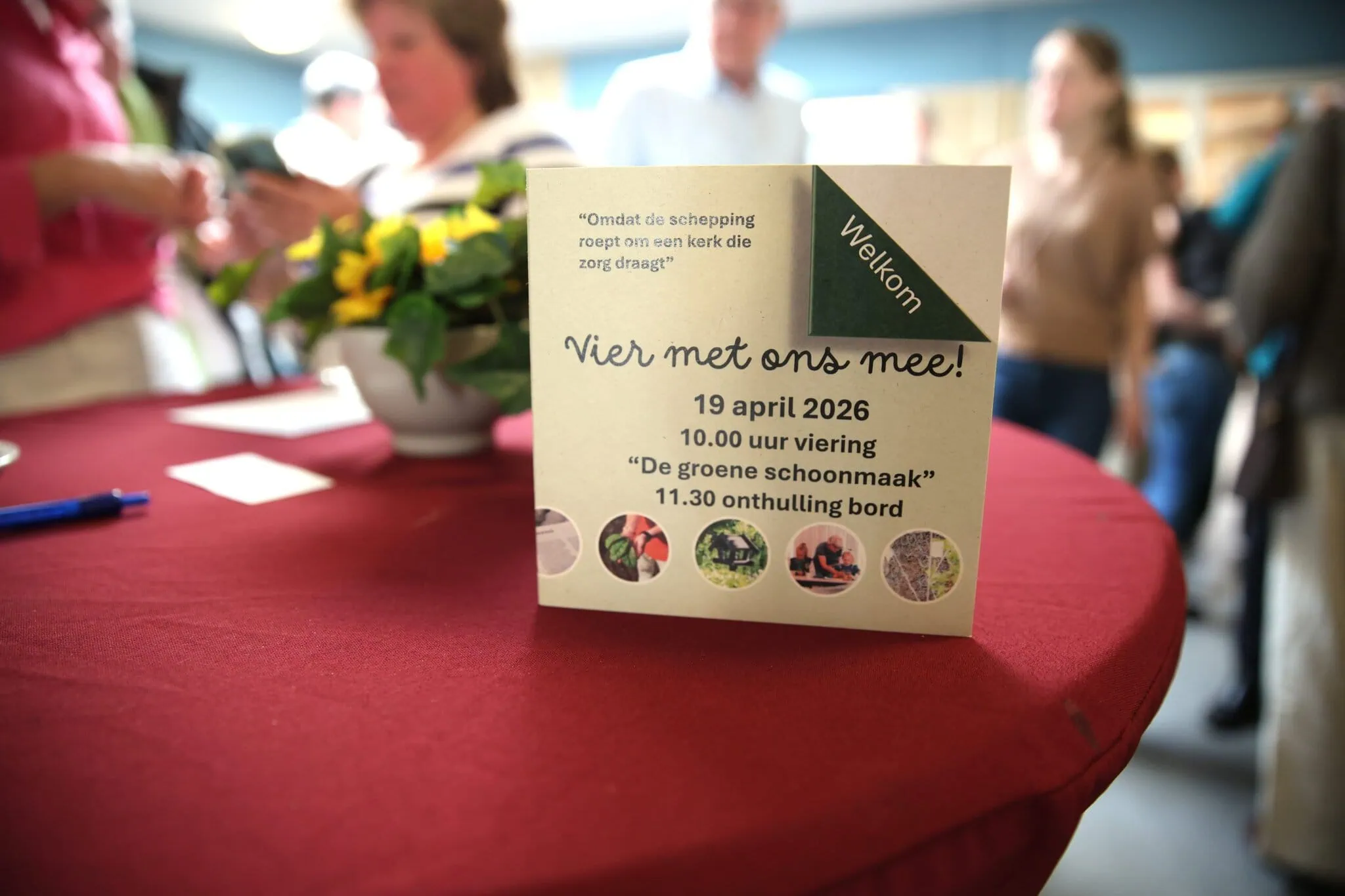 Na de dienst was er eigengebakken biologische appeltaart bij de koffie én een kleine tentoonstelling over groen schoonmaken. Ook werd het nieuwe bordje onthuld, uiteraard met een feestelijk (en biologisch) glaasje. Er was een duurzame markt met tips voor mensen thuis. Buren en leden van het netwerk Groene Kerken waren ook uitgenodigd. Een mooie kans om nieuwe mensen te ontmoeten en een groen gesprek aan te knopen.