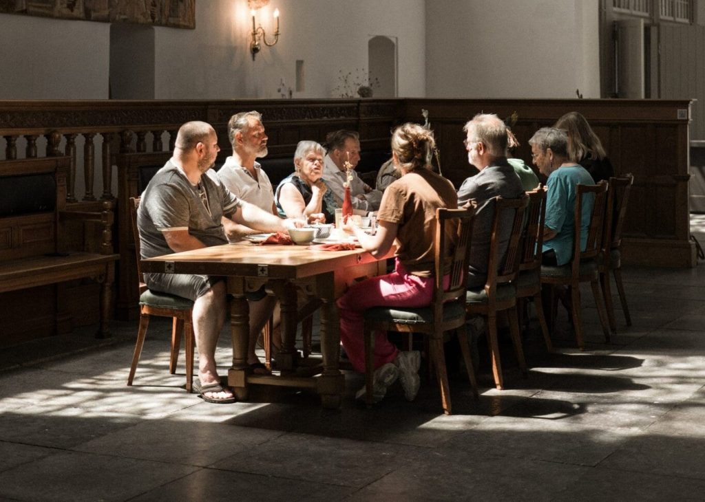 ‘Als eerste de setting. Het begint met eten, met gastvrijheid. Dat wordt door deelnemers enorm gewaardeerd, dat er mensen speciaal voor hen lekker koken. Samen eten zorgt voor verbinding en Alpha start ook echt vanuit de relatie. In kleine groepen vindt het eerlijke gesprek plaats waar vragen en twijfels gedeeld mogen worden. Dat verrast deelnemers vaak, dat ze het ergens niet mee eens mogen zijn. Dat vind ik het mooie aan Alpha: mensen met zoveel verschillende achtergronden bij elkaar die samen diepgaande gesprekken voeren. Mensen zeggen weleens dat ze hier gesprekken voeren die ze zelfs met hun beste vrienden niet hebben. In een tijd van polarisatie is het meer dan ooit nodig met elkaar aan tafel te zitten en het gesprek met elkaar aan te gaan. Je mag van mening verschillen, maar luister naar elkaar en leer van elkaar. Zoekende mensen stellen soms vragen die we als christenen niet aan elkaar stellen. Maar hoezo geloof je dat je zonden vergeven zijn, hoe werkt dat dan?’