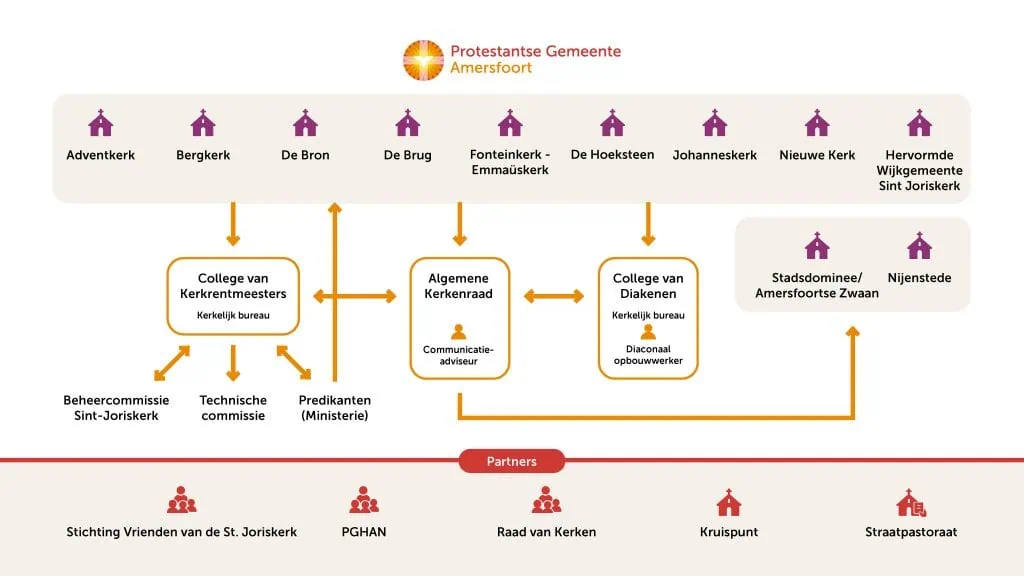 Beide colleges zitten, samen met afgevaardigden van de wijkgemeenten, in de Algemene Kerkenraad (AK). De AK neemt besluiten over de richting waarin de PGA gaat, ondersteunt de individuele wijken. Binnen de AK is er ook een moderamen, een kleinere groep die verantwoordelijk is voor de dagelijkse gang van zaken. Gerard Raven is voorzitter van de AK.
