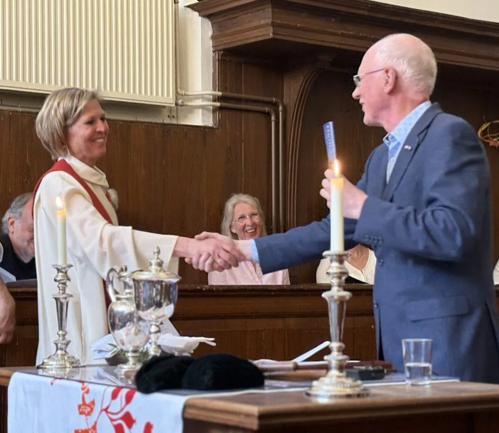 Ook Gerard Raven sprak als voorzitter van de AK van Protestantse Gemeente Amersfoort Marleen toe. Blij om 750 jaar na opbouw van deze plek van gastvrijheid (NB de Heilige Geest-kapel) nu in 2025 weer een nieuwe dominee aan te kunnen stellen. Hij sprak ook over de hoopvolle boodschap over de toekomst van de stadsdominee en de Amersfoortse Zwaan. De Zwaan bloeit en wij bloeien mee!